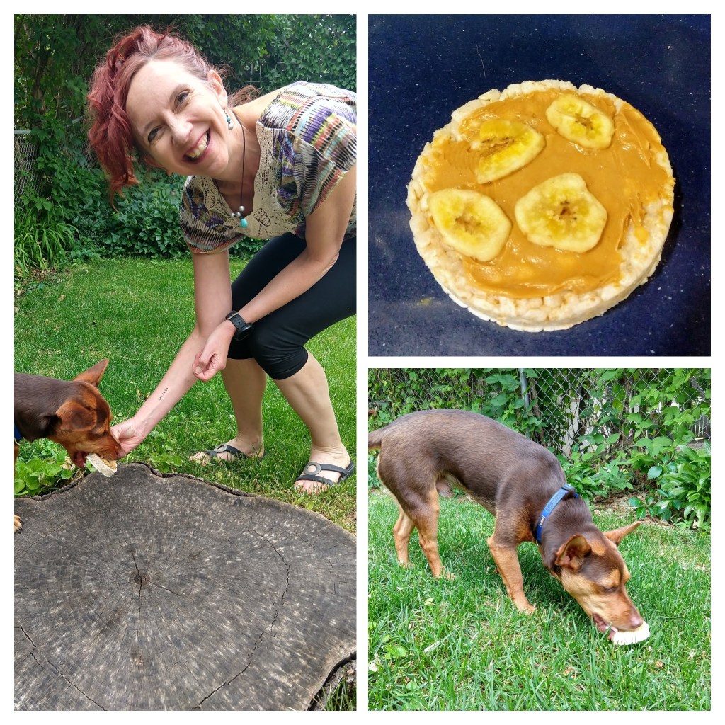 So, what better way to celebrate StanLee’s birthday than by making him take selfies with me! Okay, he actually got to go “fishing” with Chad (his favorite game) and I made him a cake! I’m actually pretty proud of the quick and lazy cake I came up with–a rice cake topped with peanut butter and dried banana chips, two of StanLee’s favorite foods (actually, mine too). I’m constantly having to watch myself so that I don’t eat up his banana chips.