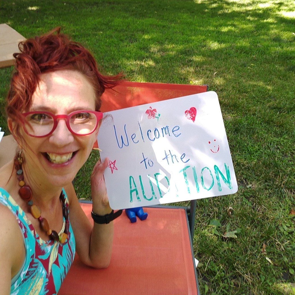 We were also trying to surprise the birthday honoree, so neither he nor most of the audience knew that we were going to perform. That gave me the chance to do a little performance art and start setting up for the play like I was just a real (although odd) person setting up for an audition in the park. This pseudo audience interaction (which Director Chad though of as we pulled into the parking lot) was fun and slightly terrifying (but I had the legitmate reason to take a selfie as part of a performance).