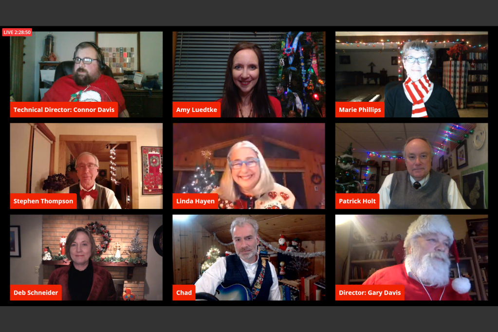 Our little DIY theater company, Applause, pulled off a bit of a miracle this weekend: We successfully (and I think, enjoyably) presented a live show via Zoom, “Uh-Oh, Here Comes Christmas.” Yes, everything was LIVE except for the music videos at the opening of each act. We didn’t just broadcast a recording of our show over Zoom but actually used the online medium to tell our story.