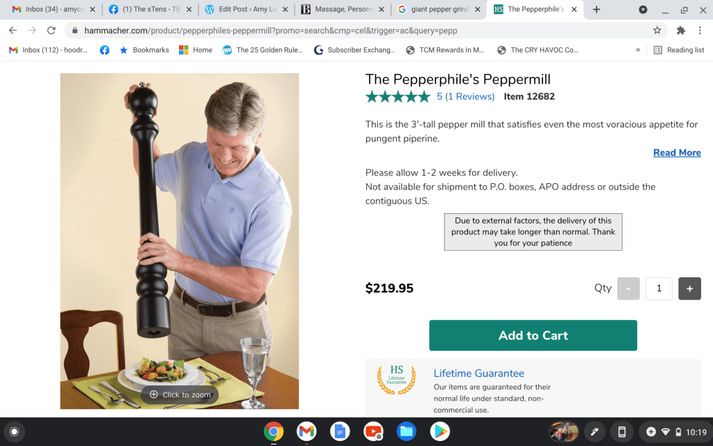 Just don’t let me get buzzed and shop from the Hammacher Schlemmer site, or I may end up trying to figure out the existential meaning of a giant pepper grinder: